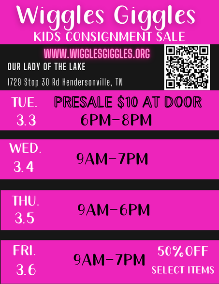 Wiggles Giggles Kids Consignment Sale is held twice a year. The sale is hosted by Moms PLUS members, a family life ministry at Our Lady of the Lake Catholic Church (OLOL) in Hendersonville, TN. Moms PLUS donates funds raised from the sale to support a variety of OLOL ministries and charities.