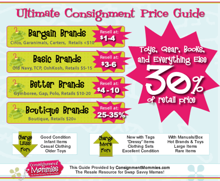 Consignment pricing generally is 30% of retail price. You should price your item to sell. If it is priced too high, then it may get passed up. A good way to ensure your items sell is to mark YES to discount. Many people shop on Friday when selected items are half off!