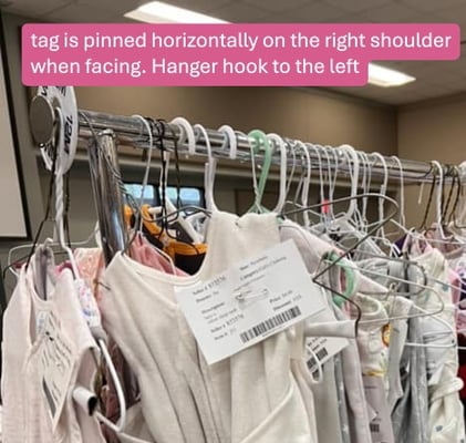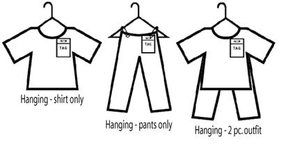 Pin tags on the right shoulder (as you look at the hanger). Clothing with more than one piece must be pinned together.
